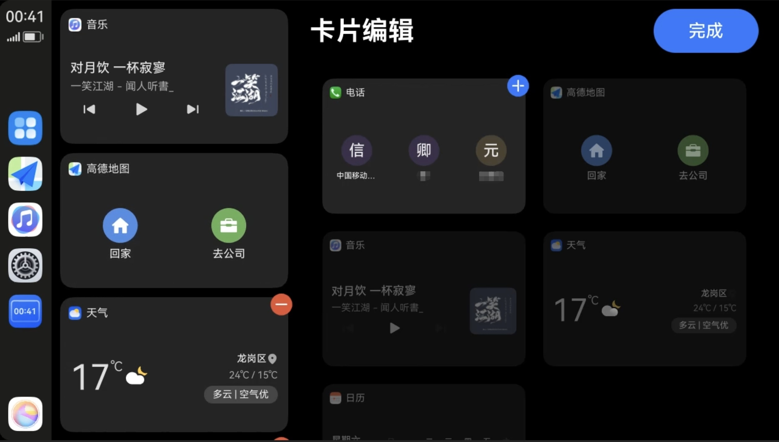 - 地图卡片:显示地图应用快捷功能,如回家、去公司等,以及在导航中显示导航简要信息。