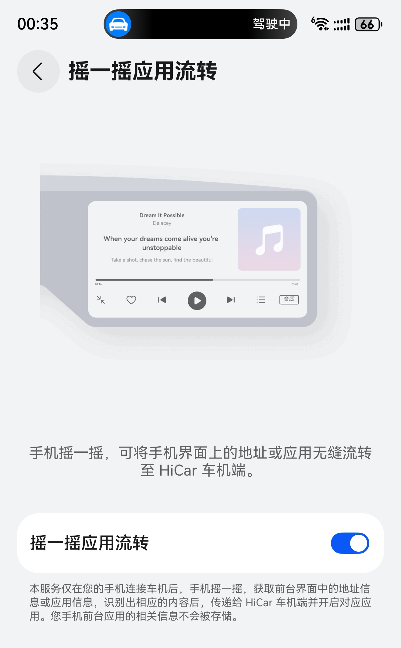 Next HiCar功能摇一摇应用流转本页总览摇一摇应用流转Next HiCar支持通过摇一摇手机,将手机中的应用流转到车机上。设置方式您可以通过如下任一方式开启摇一摇导航流转:进入手机“设置 > 多设备协同 > HUAWEI HiCar”,点击我的设备中已连接的设备,打开摇一摇应用流转开关。在HiCar连接后,在车机侧进入“设置 > 摇一摇导航流转”,打开摇一摇应用流转开关。操作步骤在手机侧打开支持摇一摇应用流转的应用,手机实况窗即可显示“可流转”字样。在横幅中,也会显示一个“流转”按钮。摇一摇手机,Next HiCar车机侧将会自动打开对应的应用。