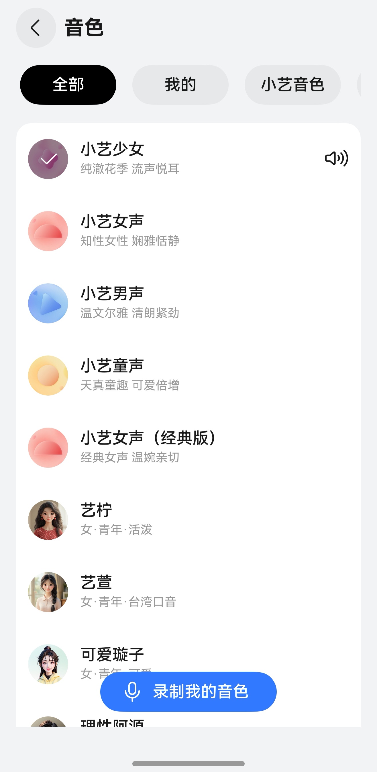 • 进入“设置 > 小艺 > 音色”,勾选您喜欢的音色。你还可以,点击“录制我的音色”,根据界面提示通过自己录制或邀请他人录制自定义声音。