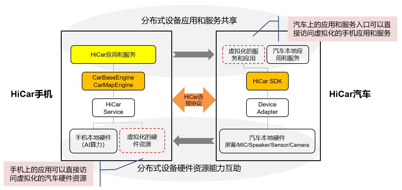 On this pageHiCar架构探讨下图是HiCar官网网站上公开的HiCar整体架构图。HiCar是由手机和车机共同组成的软硬件系统。我们分别从用户使用的视角和开发者的视角讲一下上面的HiCar架构。用户使用的视角