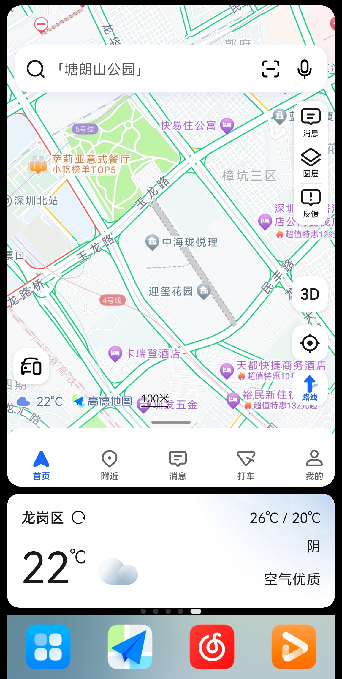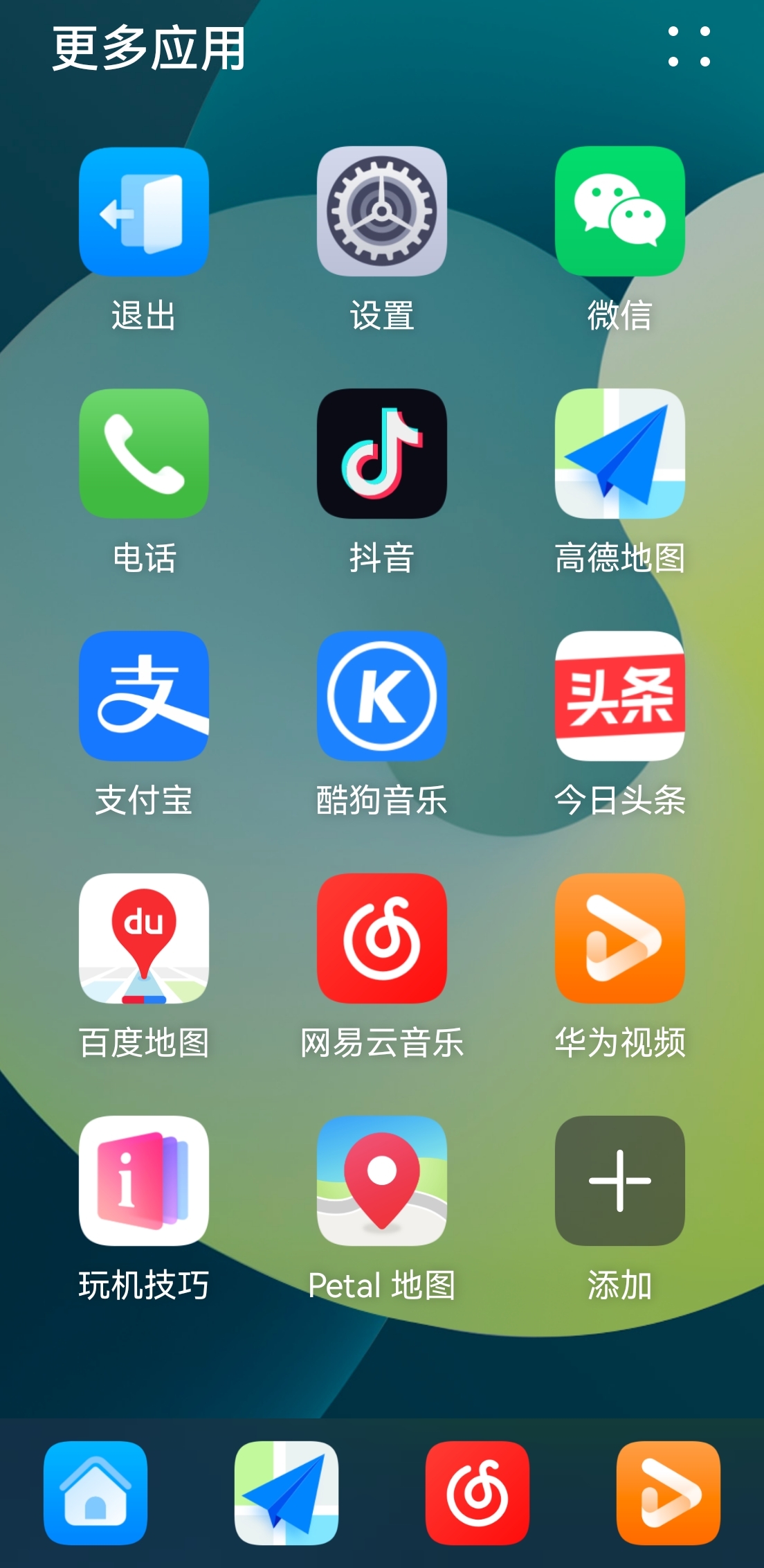 在更多应用的列表中随意打开一个应用,您都可以直接进入应用,此时底部会一直存在一个Dock区,可以随时切换到导航、音乐等界面,便于您在开车等红绿灯随时切换应用。