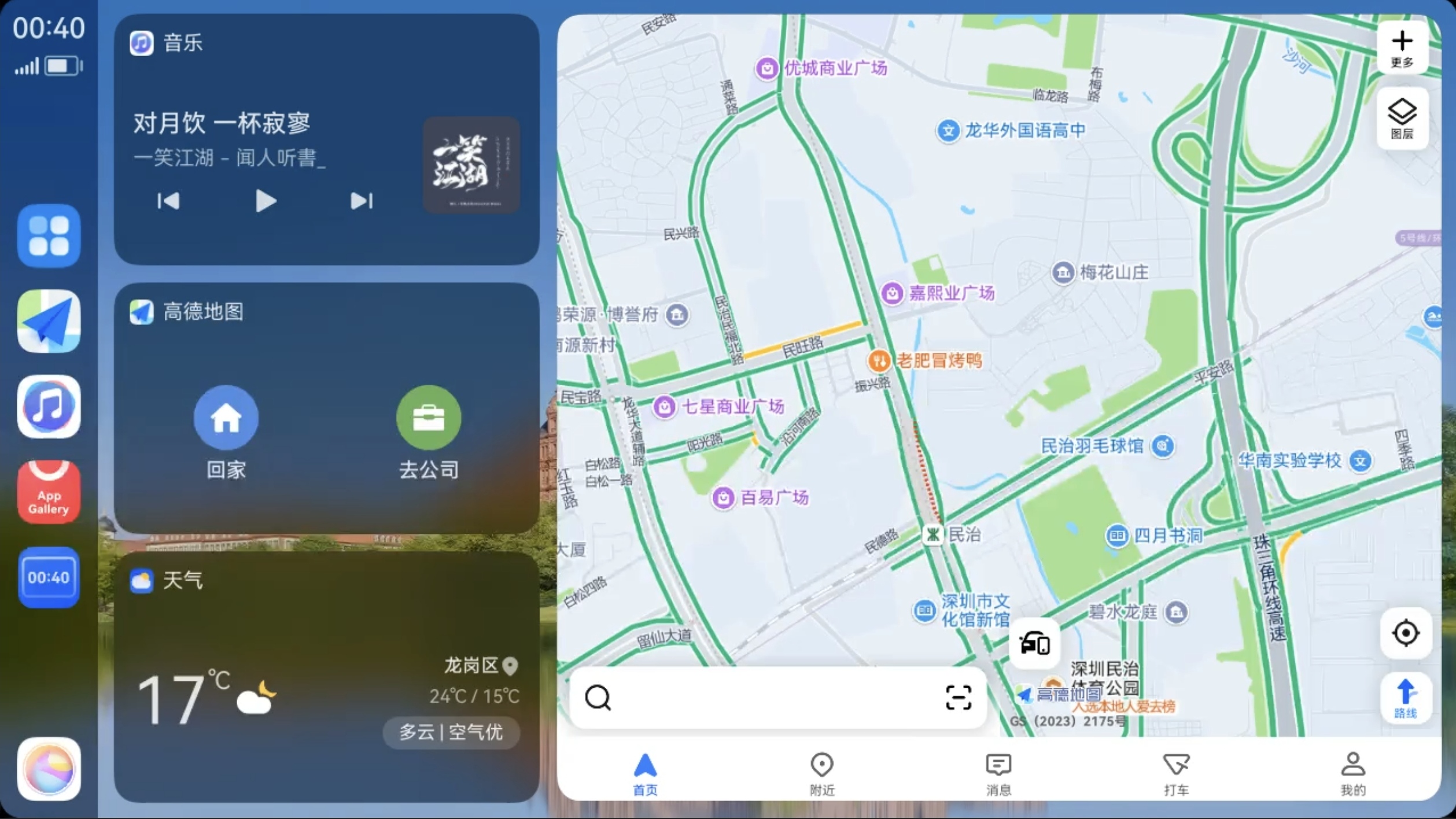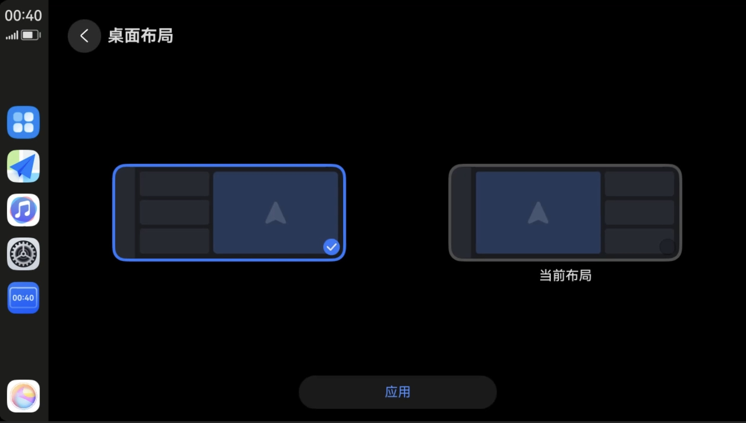 Next HiCar界面桌面On this page桌面桌面是您日常进入Next HiCar时显示的第一个界面。智慧桌面智慧桌面布局中,地图卡片更突出,可以直接在卡片中显示更详细的地图信息,支持在其他卡片区域上下滑动查看更多卡片。您可以根据喜好设置地图卡片的左右显示位置。切换桌面布局您可以在“设置 > 桌面布局”中选择您偏好的布局方式,应用后立即生效。