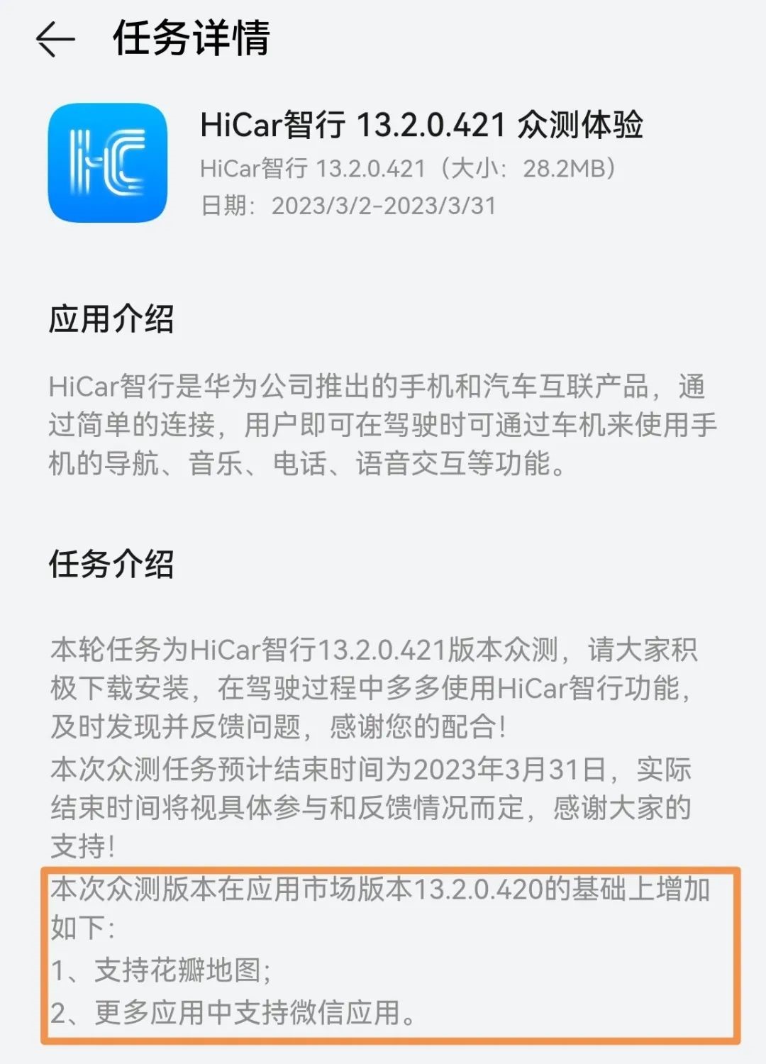 一般在正式版本发布之后的一两天之内,HiCar会在会员中心中紧跟着推送一个版本号加一的众测版本,该众测版本是在正式版本的基础之上,增加对花瓣地图、更多应用中微信的支持。